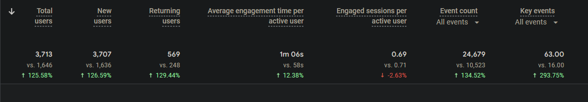 Google Analytics confirmed traffic and engagement improvements. Total users climbed from 1,646 to 3,713, a 126% increase, while new users rose by 126% and returning users by 129%. Event counts more than doubled to 24,679, and key conversions grew from 16 to 63, a 294% increase. Average engagement time also improved slightly, showing visitors were spending more time with our content.