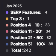 Comparing the screenshots below, one obvious thing to note is that the client’s overall number of keyword rankings has dropped since the project started. This goes against one of our stated goals, but we are still confident that the client is in a better overall position now than they were at project start. The reason for this is that while we haven’t (yet) achieved ‘more keywords’, we have been improving the position of the rankings we have, as follows: