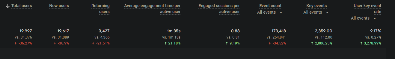 Another win to report here – the important metric in the screenshot below is ‘Key Events’, and as you can see, there’s been a big improvement, as it has improved by over 2000% during the project.