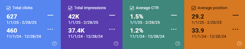 JAG also wanted to increase the number of clicks their site was getting through appearing in search results, and as the screenshot below shows, we did achieve that goal. Though it wasn’t one of JAG’s goals for the project, we’d also like to highlight the increase in impressions that has been recorded in the screenshot below, indicating that our work was also getting JAG pages seen more often in search results.