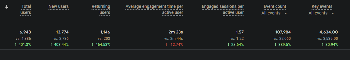 Google Analytics 4 confirmed the boost in performance. Total users grew from 1,386 to 6,948, a 401% increase, with new users up 403% and returning users up 465%. Event counts jumped by 390%, while key conversion events rose by 31%. Engagement also strengthened, with nearly 29% more engaged sessions per user, showing that visitors are interacting with more of the site.