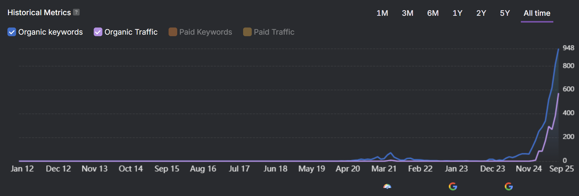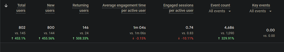 As the screenshots below show, traffic to the website (the purple line in the chart below, and the “Total Users” and “New Users” metrics in the screenshot below) definitely increased between the start of the project in June 2023 and its end in January 2025. Achieved!